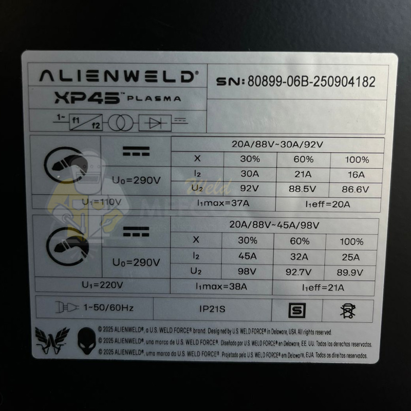 • TECNOLOGÍA DE CONTROL: Incluye una pantalla LCD digital (común en la línea XP de Alienweld) para visualizar parámetros como el amperaje y la presión de aire.