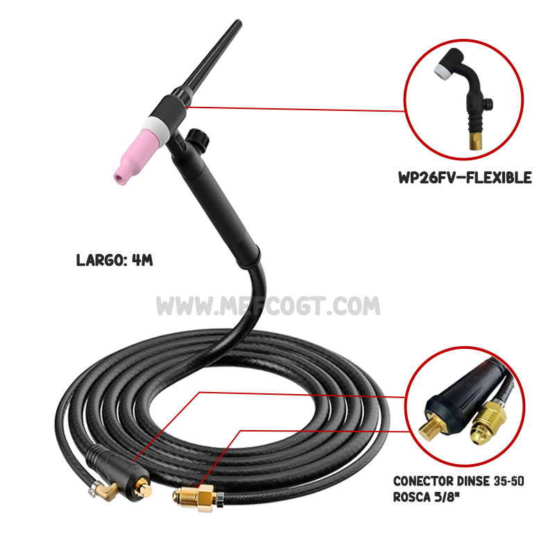 La antorcha WP26FV DINSE 35-50 es una antorcha con cuello flexible, que brinda la posibilidad de doblarse en diferentes ángulos, facilitando el acceso a lugares difíciles. Adicional cuenta con una válvula manual que el operador abre para dar paso al gas de protección.